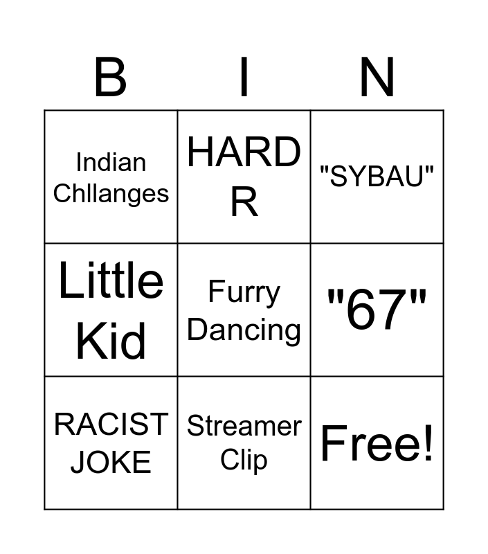 This bingo card has 9 words: RACIST JOKE, "SYBAU", HARD R, Little Kid, Indian Chllanges, "67", Furry Dancing, Free! and Streamer Clip.