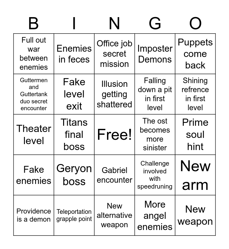 This bingo card has a free space and 24 words: Geryon boss, Teleportation grapple point, Illusion getting shattered, Providence is a demon, Puppets come back, Full out war between enemies, Guttermen and Guttertank duo secret encounter, Enemies in feces, The ost becomes more sinister, Gabriel encounter, Falling down a pit in first level, Theater level, Challenge involved with speedruning, New arm, Fake level exit, More angel enemies, Prime soul hint, Office job secret mission, Shining refrence in first level, Titans final boss, New weapon, Fake enemies, Imposter Demons and New alternative weapon.