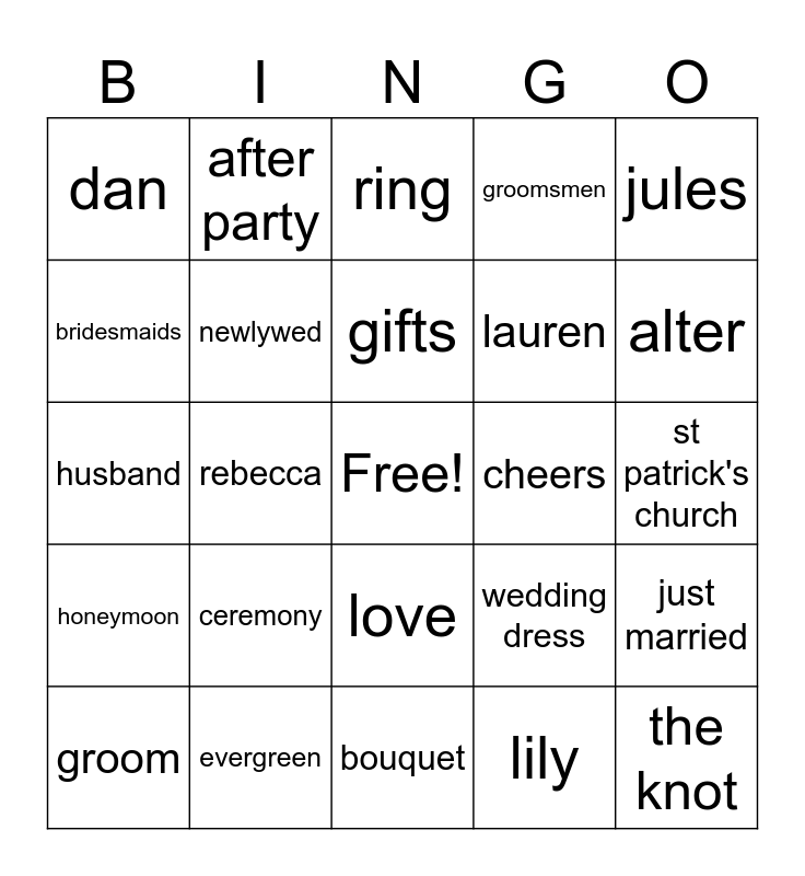 This bingo card has a free space and 51 words: wedding, the knot, aisle, bouquet, ceremony, party, after party, guests, bridesmaids, best man, newlywed, groomsmen, just married, wedding dress, rsvp, cards, gifts, cheers, maid of honor, jules, rebecca, lily, dan, lauren, ashley, the elks, alter, bride, groom, ring, mr & mrs, i do, wneu, oit, churchill, evergreen, shallow, cake, tux, toast, st patrick's church, honeymoon, vows, kiss, michelle, antonio, husband, wife, first dance, love and blessing.