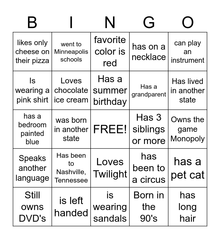 This bingo card has a free space and 24 words: Has been to Nashville, Tennessee, is left handed, Has a summer birthday, Still owns DVD's, can play an instrument, likes only cheese on their pizza, Is wearing a pink shirt, went to Minneapolis schools, Has 3 siblings or more, Loves Twilight, Has a grandparent, has a bedroom painted blue, has been to a circus, has a pet cat, Loves chocolate ice cream, Born in the 90's, Owns the game Monopoly, favorite color is red, Has lived in another state, was born in another state, has long hair, Speaks another language, has on a necklace and is wearing sandals.