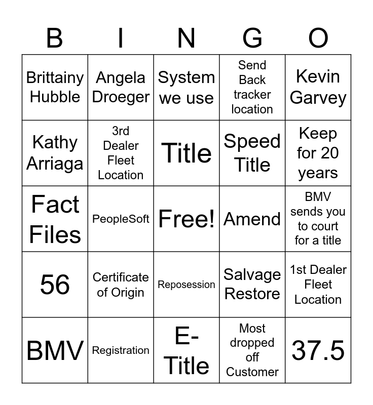 This bingo card has a free space and 24 words: Certificate of Origin, Registration, Title, BMV, Kevin Garvey, Brittainy Hubble, Kathy Arriaga, Angela Droeger, Amend, Reposession, Speed Title, Fact Files, Salvage Restore, 1st Dealer Fleet Location, 3rd Dealer Fleet Location, Most dropped off Customer, BMV sends you to court for a title, System we use, Keep for 20 years, PeopleSoft, 37.5, 56, Send Back tracker location and E-Title.