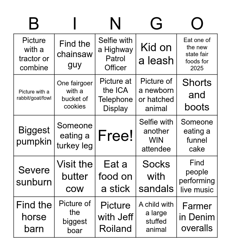 This bingo card has a free space and 24 words: Visit the butter cow, Picture of the biggest boar, Picture at the ICA Telephone Display, Find the horse barn, Eat one of the new state fair foods for 2025, Picture with a tractor or combine, Picture with a rabbit/goat/fowl, Find the chainsaw guy, Selfie with another WIN attendee, Eat a food on a stick, Picture of a newborn or hatched animal, Biggest pumpkin, Socks with sandals, Find people performing live music, One fairgoer with a bucket of cookies, A child with a large stuffed animal, Someone eating a funnel cake, Selfie with a Highway Patrol Officer, Shorts and boots, Someone eating a turkey leg, Farmer in Denim overalls, Severe sunburn, Kid on a leash and Picture with Jeff Roiland.