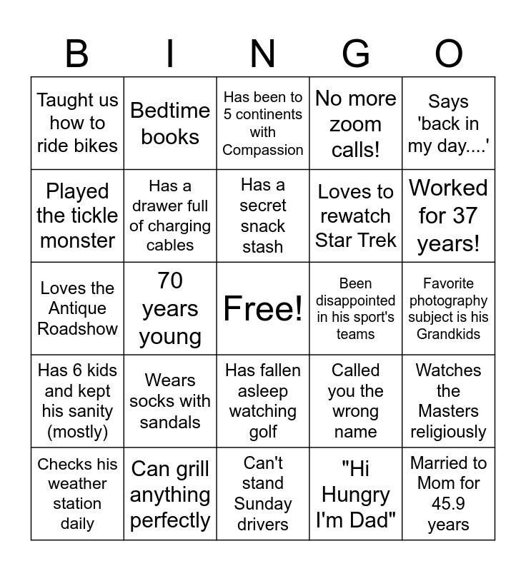 This bingo card has a free space and 24 words: Wears socks with sandals, Can grill anything perfectly, Has a secret snack stash, Checks his weather station daily, Says 'back in my day....', Taught us how to ride bikes, Played the tickle monster, Bedtime books, Been disappointed in his sport's teams, Has fallen asleep watching golf, Loves to rewatch Star Trek, Loves the Antique Roadshow, Called you the wrong name, Watches the Masters religiously, Has a drawer full of charging cables, "Hi Hungry I'm Dad", Favorite photography subject is his Grandkids, Has been to 5 continents with Compassion, Worked for 37 years!, 70 years young, Married to Mom for 45.9 years, Has 6 kids and kept his sanity (mostly), No more zoom calls! and Can't stand Sunday drivers.
