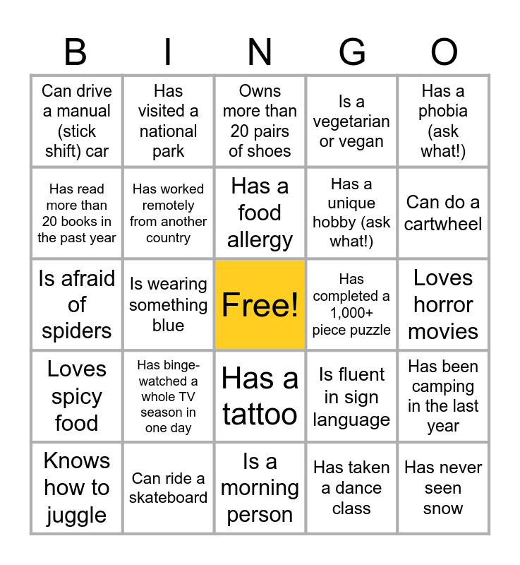 This bingo card has a free space and 90 words: Has traveled to another continent, Speaks more than two languages, Has a tattoo, Can play a musical instrument, Has met a celebrity, Has broken a bone, Is a twin or has twin siblings, Has a pet that isn’t a dog or cat, Loves pineapple on pizza, Is left-handed, Has run a marathon or race, Has never been on a plane, Was born in the same month as you, Loves horror movies, Has appeared on TV or in a newspaper, Has a food allergy, Has gone skydiving or bungee jumping, Has a birthday in December, Has worked in customer service, Prefers tea over coffee, Has dyed their hair a bright color, Can whistle, Is a morning person, Has been to more than 10 countries, Is afraid of spiders, Can ride a skateboard, Has been to a concert this year, Wears contacts or glasses, Can touch their toes without bending knees, Is the oldest sibling, Has never had a cavity, Has been camping in the last year, Has participated in a talent show, Loves spicy food, Can drive a manual (stick shift) car, Is a vegetarian or vegan, Owns more than 20 pairs of shoes, Has been to a theme park in the last year, Is wearing something blue, Can do a cartwheel, Knows how to juggle, Has read more than 20 books in the past year, Has had braces, Has never seen Star Wars, Can recite a poem from memory, Is fluent in sign language, Was born in another country, Has a plant at their desk or in their room, Has ridden a horse, Has volunteered in the past 6 months, Doesn’t like chocolate, Has a unique hobby (ask what!), Owns a vinyl record player, Knows how to knit or crochet, Has been scuba diving or snorkeling, Prefers cats over dogs, Has completed a 1,000+ piece puzzle, Has a hidden talent (ask what!), Doesn’t use social media, Has run out of gas before, Owns a collection of something unusual, Can solve a Rubik's Cube, Has changed careers, Has gone 24 hours without using a phone, Was named after someone, Can name all 50 U.S. states (or all your country’s provinces/regions), Knows how to bake bread from scratch, Has taken a dance class, Can drive a motorcycle, Knows how to say “hello” in 5+ languages, Has binge-watched a whole TV season in one day, Has never seen snow, Has a bucket list and has completed something on it, Still owns something from childhood, Has visited a national park, Has worked remotely from another country, Knows how to code, Can say the alphabet backwards, Has gone viral on social media, Has had a surprise party thrown for them, Has completed a home renovation or DIY project, Has a phobia (ask what!), Has won a contest, raffle, or lottery, Has participated in a protest or march, Has kept a journal for more than a year, Has tried an extreme sport (rock climbing, surfing, etc.), Is in or has been in a band or choir, Has a nickname most people don’t know, Has memorized a movie quote or scene and Can say all the planets in order.