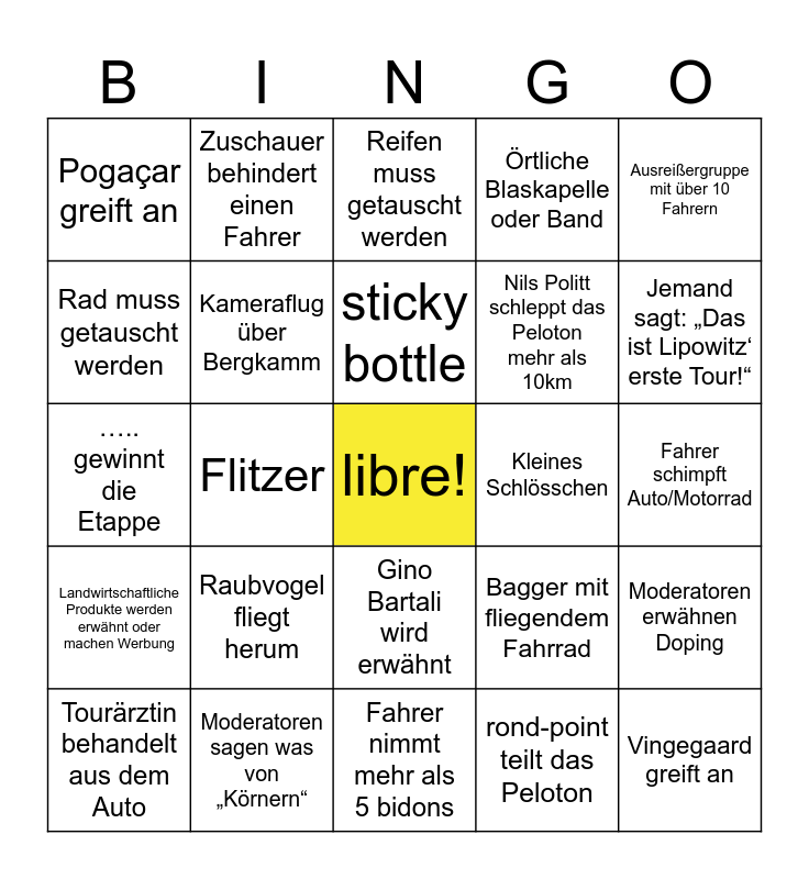 This bingo card has a free space and 24 words: Raubvogel fliegt herum, Moderatoren sagen was von „Körnern“, sticky bottle, Tourärztin behandelt aus dem Auto, Ausreißergruppe mit über 10 Fahrern, Pogaçar greift an, Rad muss getauscht werden, Zuschauer behindert einen Fahrer, Kleines Schlösschen, Gino Bartali wird erwähnt, Nils Politt schleppt das Peloton mehr als 10km, ….. gewinnt die Etappe, Bagger mit fliegendem Fahrrad, Moderatoren erwähnen Doping, Kameraflug über Bergkamm, rond-point teilt das Peloton, Fahrer schimpft Auto/Motorrad, Reifen muss getauscht werden, Jemand sagt: „Das ist Lipowitz‘ erste Tour!“, Flitzer, Vingegaard greift an, Landwirtschaftliche Produkte werden erwähnt oder machen Werbung, Örtliche Blaskapelle oder Band and Fahrer nimmt mehr als 5 bidons.