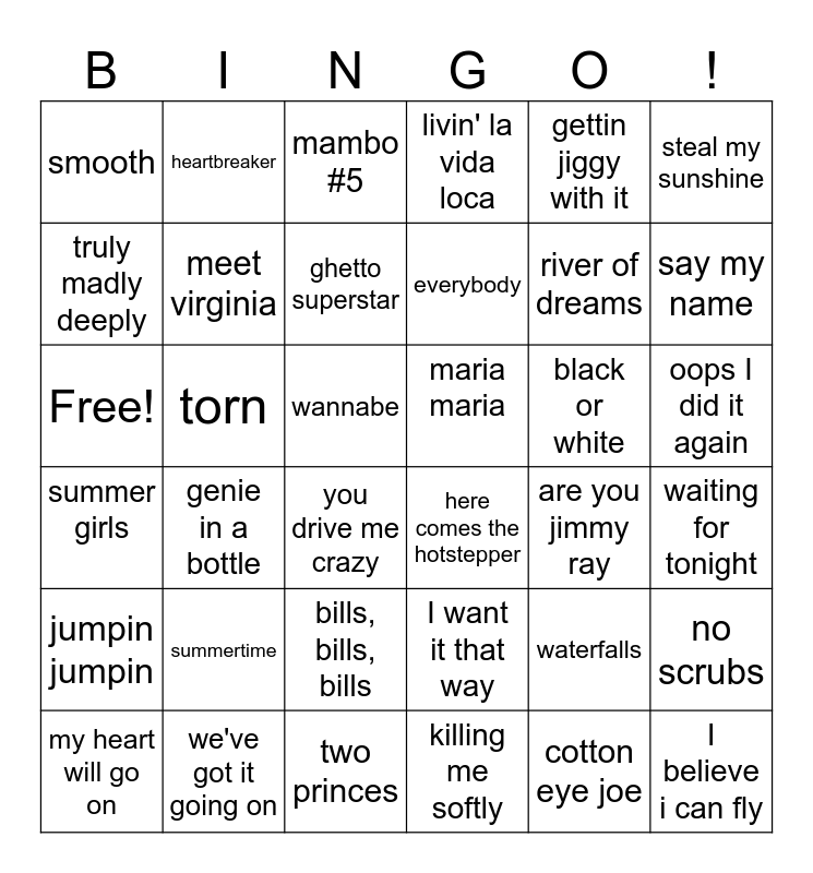 This bingo card has 36 words: I want it that way, bills, bills, bills, killing me softly, truly madly deeply, summer girls, maria maria, meet virginia, two princes, gettin jiggy with it, waterfalls, say my name, livin' la vida loca, no scrubs, torn, everybody, smooth, jumpin jumpin, black or white, Free!, mambo #5, wannabe, genie in a bottle, here comes the hotstepper, you drive me crazy, are you jimmy ray, heartbreaker, river of dreams, we've got it going on, ghetto superstar, steal my sunshine, I believe i can fly, my heart will go on, waiting for tonight, oops I did it again, summertime and cotton eye joe.