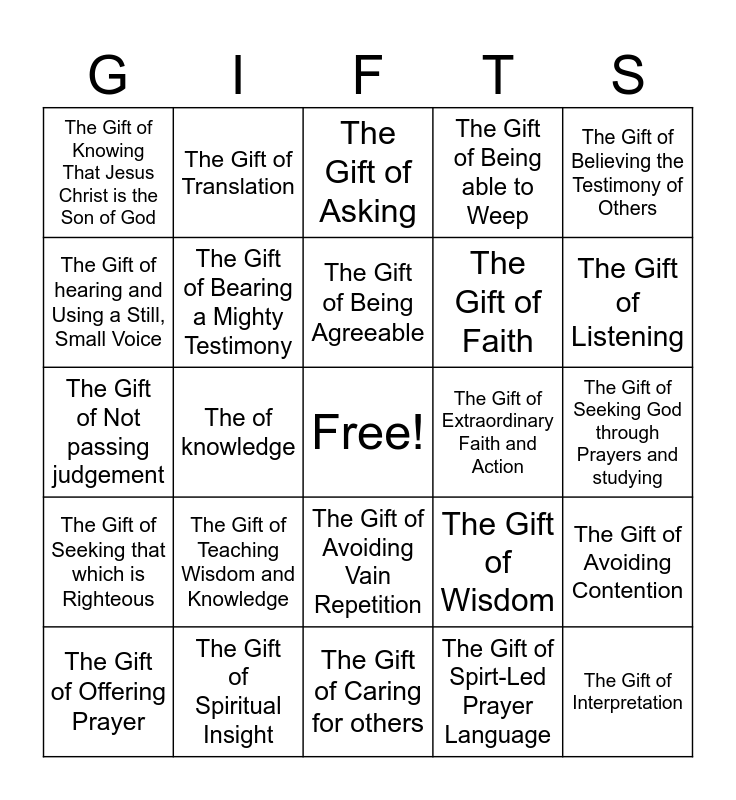 This bingo card has a free space and 24 words: The Gift of Teaching Wisdom and Knowledge, The Gift of Spiritual Insight, The Gift of Being Agreeable, The Gift of Offering Prayer, The Gift of Believing the Testimony of Others, The Gift of Knowing That Jesus Christ is the Son of God, The Gift of hearing and Using a Still, Small Voice, The Gift of Translation, The Gift of Extraordinary Faith and Action, The Gift of Avoiding Vain Repetition, The Gift of Faith, The Gift of Not passing judgement, The Gift of Wisdom, The Gift of Avoiding Contention, The Gift of Bearing a Mighty Testimony, The Gift of Spirt-Led Prayer Language, The Gift of Seeking God through Prayers and studying, The Gift of Asking, The Gift of Listening, The of knowledge, The Gift of Interpretation, The Gift of Seeking that which is Righteous, The Gift of Being able to Weep and The Gift of Caring for others.