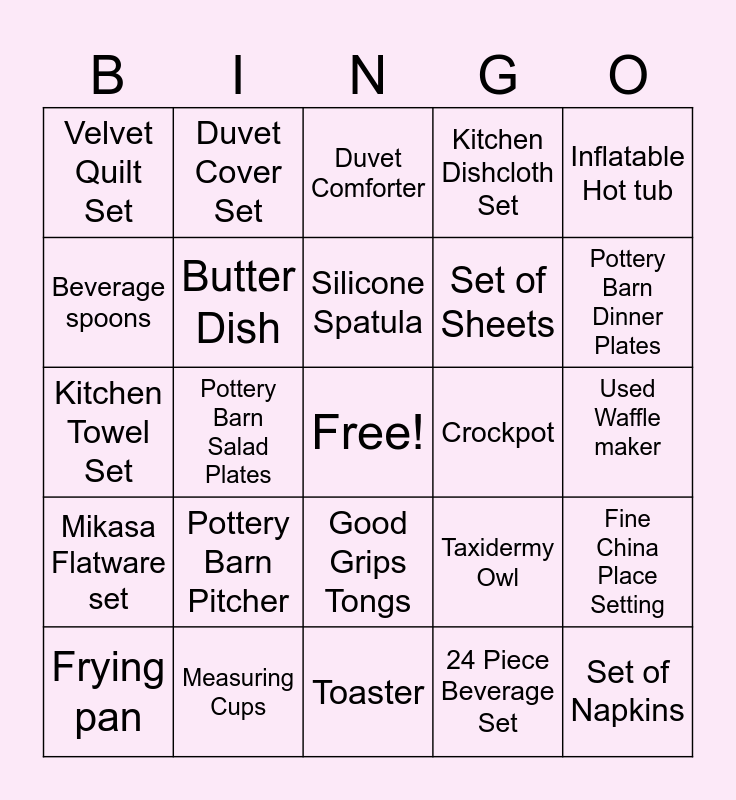 This bingo card has a free space and 28 words: Fine China Place Setting, Food Processor, Set of Sheets, 24 Piece Beverage Set, Beverage spoons, Duvet Comforter, Duvet Cover Set, Mikasa Flatware set, Crockpot, Frying pan, Kitchen Towel Set, Kitchen Dishcloth Set, Measuring Cups, Toaster, Pottery Barn Dinner Plates, Pottery Barn Cereal Bowls, Pottery Barn Pitcher, Butter Dish, Silicone Spatula, Good Grips Tongs, Velvet Quilt Set, Gold Bamboo Flatware Set, Set of Napkins, Pottery Barn Salad Plates, Used Waffle maker, Taxidermy Owl, Inflatable Hot tub and Bag of Onions.
