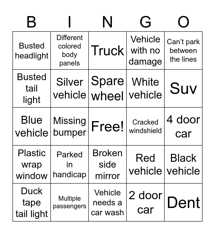This bingo card has a free space and 24 words: Parked in handicap, Multiple passengers, Spare wheel, Duck tape tail light, Can’t park between the lines, Busted headlight, Busted tail light, Different colored body panels, Cracked windshield, Broken side mirror, White vehicle, Blue vehicle, Red vehicle, Black vehicle, Silver vehicle, 2 door car, 4 door car, Truck, Suv, Missing bumper, Dent, Plastic wrap window, Vehicle with no damage and Vehicle needs a car wash.