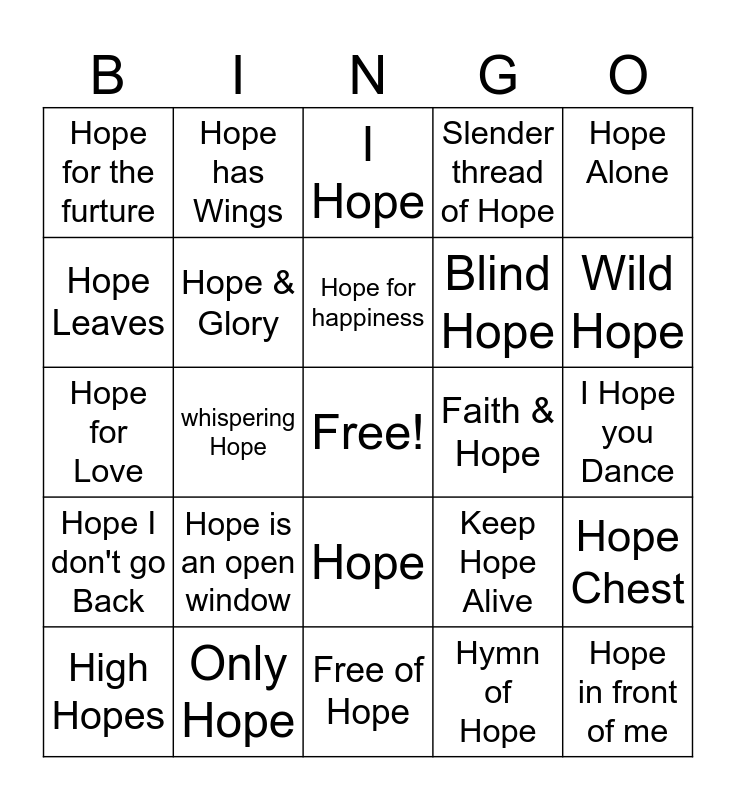 This bingo card has a free space and 29 words: High Hopes, Hold on Hope, whispering Hope, Losing Hope, Hope for the furture, I Hope, Hope & Glory, Hope is an open window, Faith & Hope, Only Hope, I Hope you Dance, Hope in front of me, Free of Hope, Hymn of Hope, Wild Hope, Harness your Hopes, Hope, Hope I don't go Back, Hope Alone, Hope for Love, Keep Hope Alive, Hope has a place, Blind Hope, Hope Leaves, Slender thread of Hope, Hope has Wings, Hope Chest, Hope for happiness and Hope & Grace.