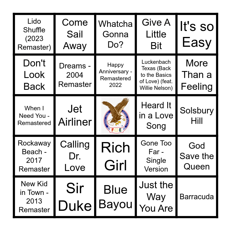 This bingo card has a free space and 48 words: Baby What a Big Surprise - 2002 Remaster, Barracuda, Black Betty, Blue Bayou, Calling Dr. Love, Cold as Ice, Come Sail Away, Dancing Queen, Don't Look Back, Don't Stop - 2004 Remaster, Dreams - 2004 Remaster, Give A Little Bit, God Save the Queen, Gone Too Far - Single Version, Goodbye Girl, Handy Man, Happy Anniversary - Remastered 2022, Heard It in a Love Song, It's a Heartache, It's so Easy, Jet Airliner, Just the Way You Are, Lido Shuffle (2023 Remaster), Luckenbach Texas (Back to the Basics of Love) (feat. Willie Nelson), Margaritaville, More Than a Feeling, New Kid in Town - 2013 Remaster, Nobody Does It Better, Rich Girl, Rockaway Beach - 2017 Remaster, Rockin' All Over The World, Sentimental Lady, She's Not There, Short People, Sir Duke, Slip Slidin' Away, So Into You, Solsbury Hill, Telephone Line, The King is Gone, The Things We Do For Love, We Are The Champions, Whatcha Gonna Do?, What's Your Name, When I Need You - Remastered, You and Me, You Light Up My Life and You're In My Heart.