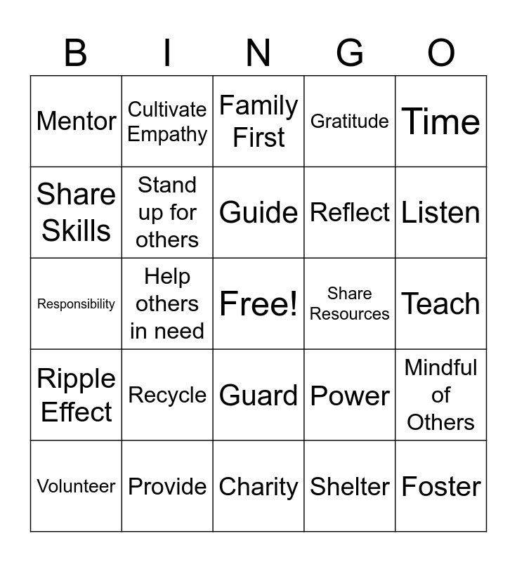 This bingo card has a free space and 29 words: Volunteer, Donate, Help others in need, Adopt, Mentor, Family First, Stand up for others, Recycle, Share Resources, Provide, Teach, Foster, Charity, Shelter, Listen, Contribute, Guard, Ripple Effect, Time, Responsibility, Power, Heart, Reflect, Share Skills, Gratitude, Cultivate Empathy, Mindful of Others, Guide and Acts of Kindness.
