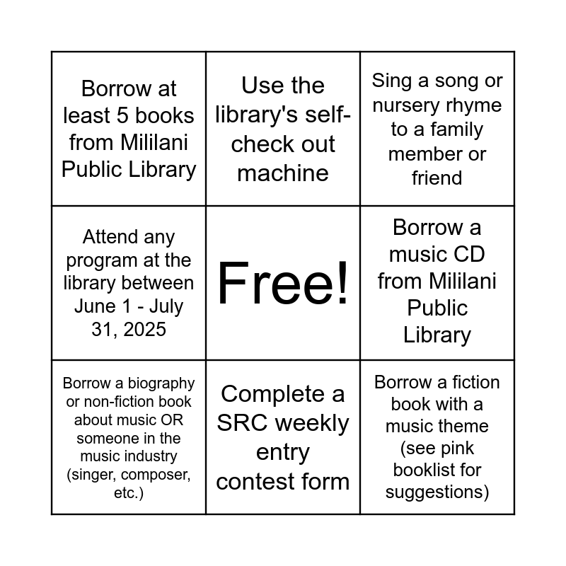 This bingo card has a free space and 8 words: Borrow a music CD from Mililani Public Library, Sing a song or nursery rhyme to a family member or friend, Use the library's self-check out machine, Borrow a biography or non-fiction book about music OR someone in the music industry (singer, composer, etc.), Borrow at least 5 books from Mililani Public Library, Borrow a fiction book with a music theme (see pink booklist for suggestions), Attend any program at the library between June 1 - July 31, 2025 and Complete a SRC weekly entry contest form.