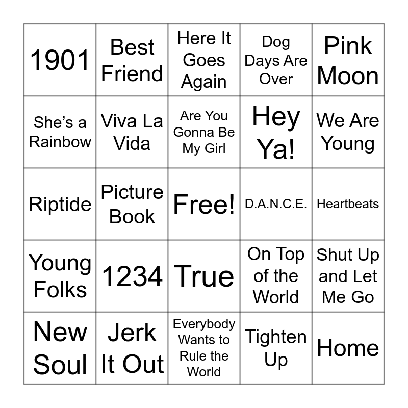 This bingo card has a free space and 24 words: 1234, Jerk It Out, Are You Gonna Be My Girl, New Soul, Pink Moon, 1901, She’s a Rainbow, Best Friend, D.A.N.C.E., True, Hey Ya!, Riptide, On Top of the World, Shut Up and Let Me Go, Viva La Vida, Tighten Up, Heartbeats, Here It Goes Again, We Are Young, Picture Book, Home, Young Folks, Dog Days Are Over and Everybody Wants to Rule the World.