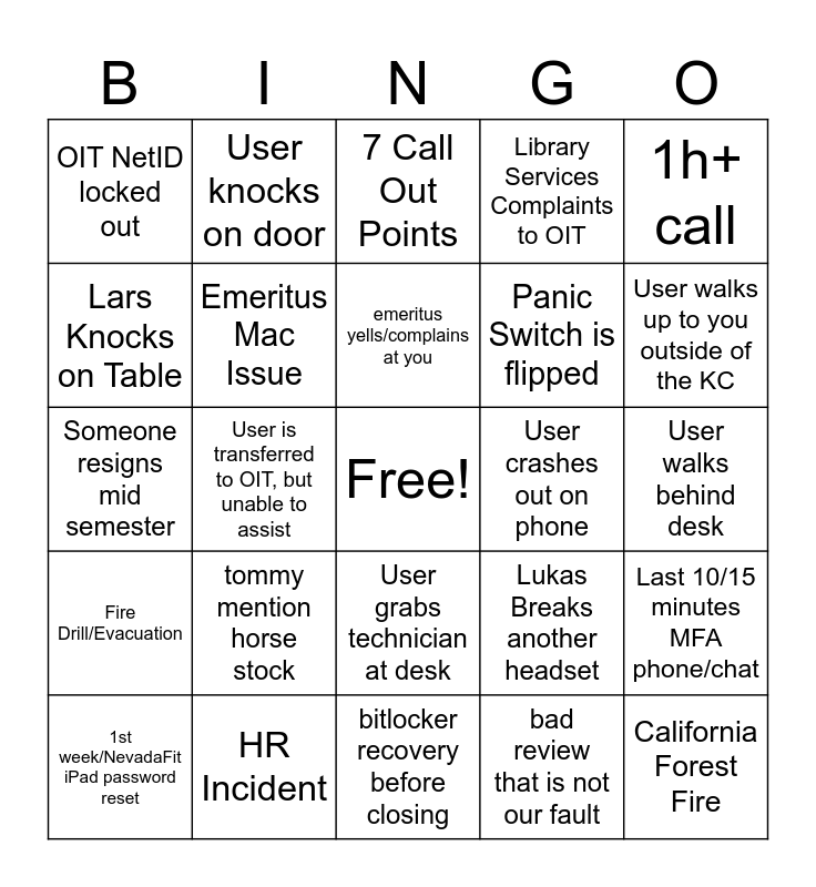 This bingo card has a free space and 25 words: tommy mention horse stock, bitlocker recovery before closing, emeritus yells/complains at you, 1st week/NevadaFit iPad password reset, 1h+ call, OIT NetID locked out, Lars Knocks on Table, User knocks on door, User crashes out on phone, User grabs technician at desk, Panic Switch is flipped, Someone resigns mid semester, Lukas Breaks another headset, Last 10/15 minutes MFA phone/chat, Emeritus Mac Issue, VOCA transfers fail, User walks behind desk, 7 Call Out Points, User walks up to you outside of the KC, User is transferred to OIT, but unable to assist, California Forest Fire, HR Incident, Fire Drill/Evacuation, Library Services Complaints to OIT and bad review that is not our fault.