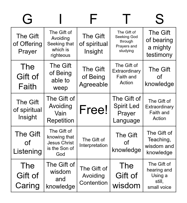 This bingo card has a free space and 24 words: The Gift of knowing that Jesus Christ is the Son of God, The Gift of wisdom and knowledge, The Gift of Being Agreeable, The Gift of Caring, The Gift of bearing a mighty testimony, The Gift of Offering Prayer, The Gift of Faith, The Gift of Avoiding Seeking that which is righteous, The Gift of Spirit Led Prayer Language, The Gift of Interpretation, The Gift of Extraordinary Faith and Action, The Gift of spiritual Insight, The Gift of knowledge, The Gift of Teaching, wisdom and knowledge, The Gift of Being able to weep, The Gift of wisdom, The Gift of Extraordinary Faith and Action, The Gift of spiritual Insight, The Gift of knowledge, The Gift of Avoiding Vain Repetition, The Gift of hearing and Using a still, small voice, The Gift of Listening, The Gift of Seeking God through Prayers and studying and The Gift of Avoiding Contention.