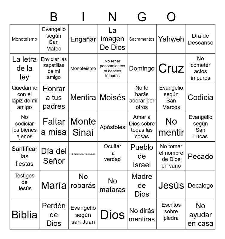 This bingo card has 51 words: Biblia, Faltar a misa, No robarás, Moisés, No te harás adorar por otros, Jesús, Día de Descanso, El espiritu de la ley, Honrar a tus padres, Monte Sinaí, La imagen De Dios, Sacramentos, No mentir, Evangelio según San Lucas, Santificar las fiestas, María, Engañar, No tener pensamientos ni deseos impuros, No dirás mentiras, Yahweh, No cometer actos impuros, No codiciar los bienes ajenos, Evangelio según San Mateo, Monoteísmo, Dios, Amar a Dios sobre todas las cosas, Cruz, No ayudar en casa, La letra de la ley, Envidiar las zapatillas de mi amigo, Evangelio según san Juan, Ocultar la verdad, Madre de Dios, Escritos sobre piedra, Pecado, Quedarme con el lápiz de mi amigo, Día del Señor, Bienaventuranzas, No mataras, Pueblo de Israel, Evangelio según San Marcos, Codicia, Testigos de Jesús, Perdón de Dios, Mentira, Apóstoles, Domingo, No tomar el nombre de Dios en vano, Decalogo, Monoteismo and 1 mandamiento.