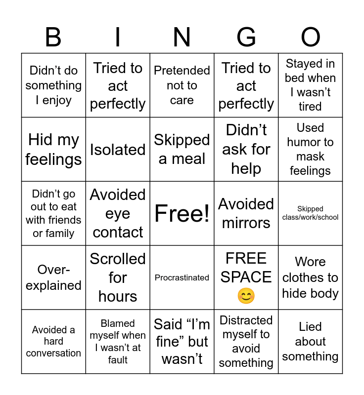 This bingo card has a free space and 25 words: Scrolled for hours, Said “I’m fine” but wasn’t, Skipped a meal, Avoided a hard conversation, Stayed in bed when I wasn’t tired, Didn’t do something I enjoy, Hid my feelings, Tried to act perfectly, Avoided mirrors, Procrastinated, Didn’t ask for help, Didn’t go out to eat with friends or family, FREE SPACE 😊, Wore clothes to hide body, Isolated, Said yes to avoid conflict, Skipped class/work/school, Pretended not to care, Used humor to mask feelings, Avoided eye contact, Lied about something, Blamed myself when I wasn’t at fault, Over-explained, Tried to act perfectly and Distracted myself to avoid something.
