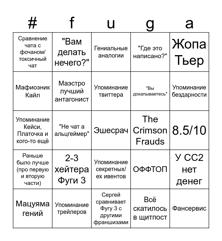 This bingo card has 25 words: 2-3 хейтера Фуги 3, Сергей сравнивает Фугу 3 с другими франшизами, Упоминание твиттера, Мацуяма гений, Жопа Тьер, Сравнение чата с фочаном/токсичный чат, Мафиозник Кайл, "Вам делать нечего?", The Crimson Frauds, Упоминание секретных/ех ивентов, "Вы докапываетесь", Упоминание Кейси, Платочка и кого-то ещё, ОФФТОП, У СС2 нет денег, Маэстро лучший антагонист, Фансервис, 8.5/10, Гениальные аналогии, Упоминание бездарности, "Не чат а альцгеймер", Эшесрач, Упоминание трейлеров, Раньше было лучше (про первую и вторую части), "Где это написано?" and Всё скатилось в щитпост.
