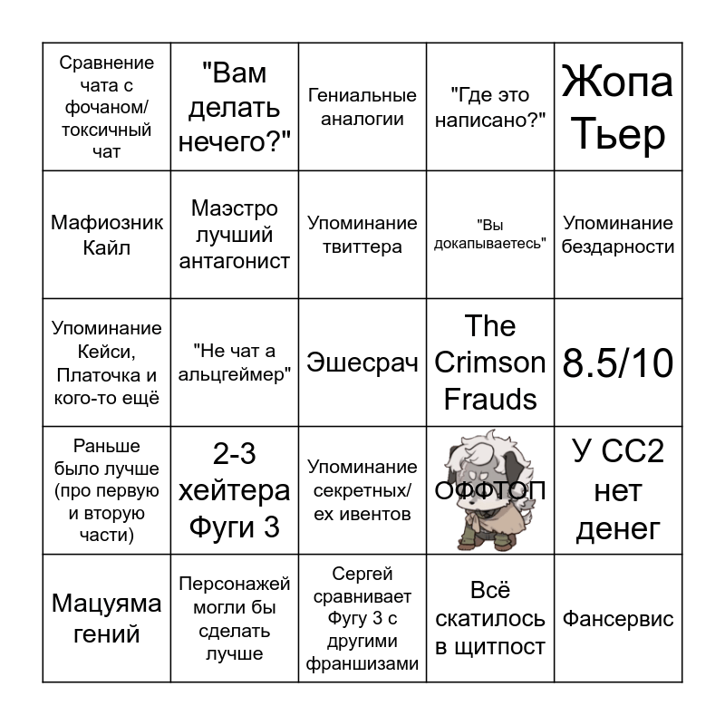 This bingo card has 1 images and 25 words: 2-3 хейтера Фуги 3, Сергей сравнивает Фугу 3 с другими франшизами, Упоминание твиттера, Мацуяма гений, Жопа Тьер, Сравнение чата с фочаном/токсичный чат, Мафиозник Кайл, "Вам делать нечего?", The Crimson Frauds, Упоминание секретных/ех ивентов, "Вы докапываетесь", Упоминание Кейси, Платочка и кого-то ещё, ОФФТОП, У СС2 нет денег, Маэстро лучший антагонист, Фансервис, 8.5/10, Гениальные аналогии, Упоминание бездарности, "Не чат а альцгеймер", Эшесрач, Персонажей могли бы сделать лучше, Раньше было лучше (про первую и вторую части), "Где это написано?" and Всё скатилось в щитпост.