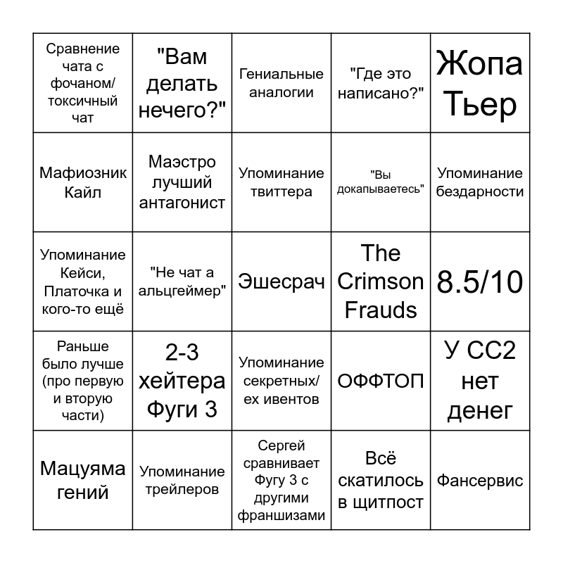 This bingo card has 25 words: 2-3 хейтера Фуги 3, Сергей сравнивает Фугу 3 с другими франшизами, Упоминание твиттера, Мацуяма гений, Жопа Тьер, Сравнение чата с фочаном/токсичный чат, Мафиозник Кайл, "Вам делать нечего?", The Crimson Frauds, Упоминание секретных/ех ивентов, "Вы докапываетесь", Упоминание Кейси, Платочка и кого-то ещё, ОФФТОП, У СС2 нет денег, Маэстро лучший антагонист, Фансервис, 8.5/10, Гениальные аналогии, Упоминание бездарности, "Не чат а альцгеймер", Эшесрач, Упоминание трейлеров, Раньше было лучше (про первую и вторую части), "Где это написано?" and Всё скатилось в щитпост.