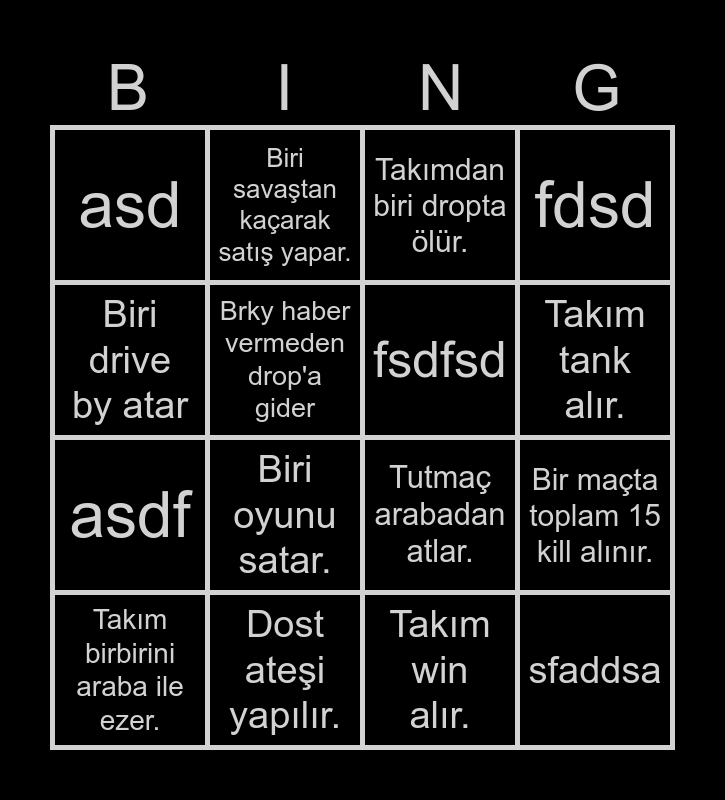 This bingo card has 16 words: Dost ateşi yapılır., Bir maçta toplam 15 kill alınır., Takımdan biri dropta ölür., asd, asdf, Biri savaştan kaçarak satış yapar., Tutmaç arabadan atlar., Takım win alır., Biri drive by atar, Brky haber vermeden drop'a gider, Takım birbirini araba ile ezer., fdsd, Biri oyunu satar., Takım tank alır., fsdfsd and sfaddsa.