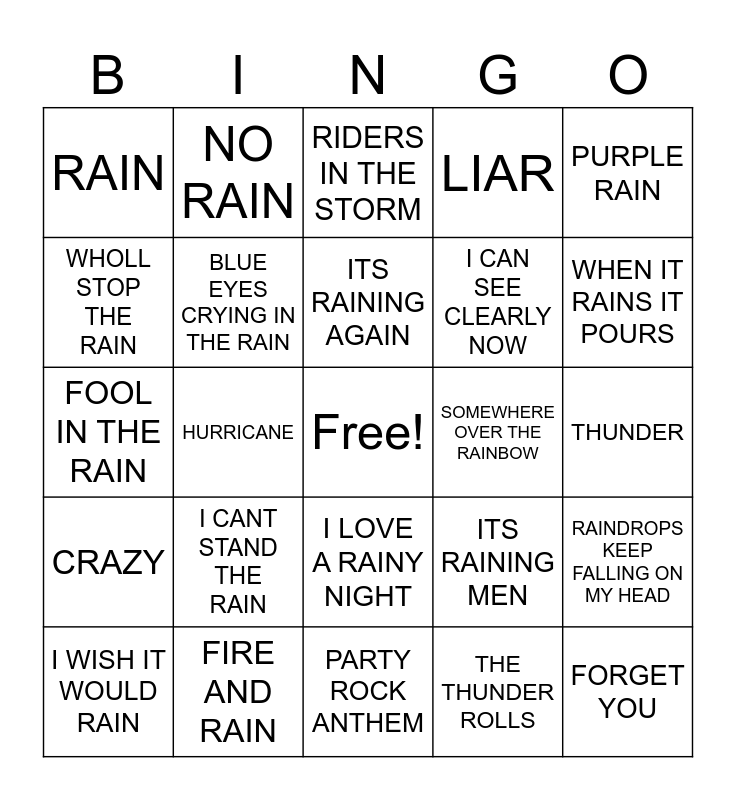 This bingo card has a free space and 24 words: I CANT STAND THE RAIN, FIRE AND RAIN, ITS RAINING AGAIN, I WISH IT WOULD RAIN, PURPLE RAIN, RAIN, WHOLL STOP THE RAIN, NO RAIN, SOMEWHERE OVER THE RAINBOW, I LOVE A RAINY NIGHT, I CAN SEE CLEARLY NOW, FOOL IN THE RAIN, ITS RAINING MEN, RAINDROPS KEEP FALLING ON MY HEAD, BLUE EYES CRYING IN THE RAIN, THE THUNDER ROLLS, THUNDER, RIDERS IN THE STORM, WHEN IT RAINS IT POURS, HURRICANE, FORGET YOU, CRAZY, LIAR and PARTY ROCK ANTHEM.