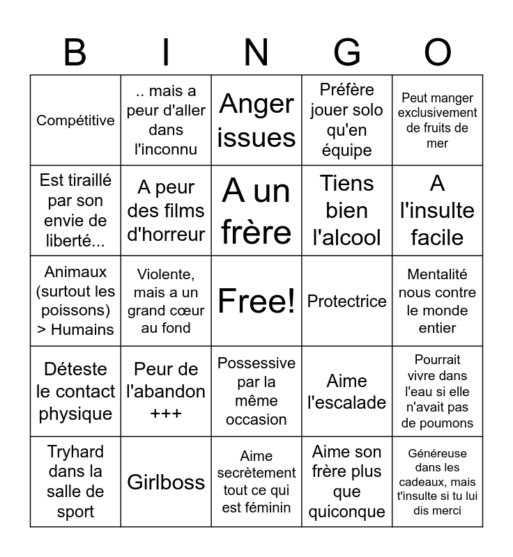 This bingo card has a free space and 24 words: Peur de l'abandon +++, Girlboss, A un frère, Tryhard dans la salle de sport, Peut manger exclusivement de fruits de mer, Compétitive, Est tiraillé par son envie de liberté..., .. mais a peur d'aller dans l'inconnu, Protectrice, Possessive par la même occasion, Tiens bien l'alcool, Animaux (surtout les poissons) > Humains, Aime l'escalade, Pourrait vivre dans l'eau si elle n'avait pas de poumons, A peur des films d'horreur, Aime son frère plus que quiconque, Mentalité nous contre le monde entier, Anger issues, A l'insulte facile, Violente, mais a un grand cœur au fond, Généreuse dans les cadeaux, mais t'insulte si tu lui dis merci, Déteste le contact physique, Préfère jouer solo qu'en équipe and Aime secrètement tout ce qui est féminin.