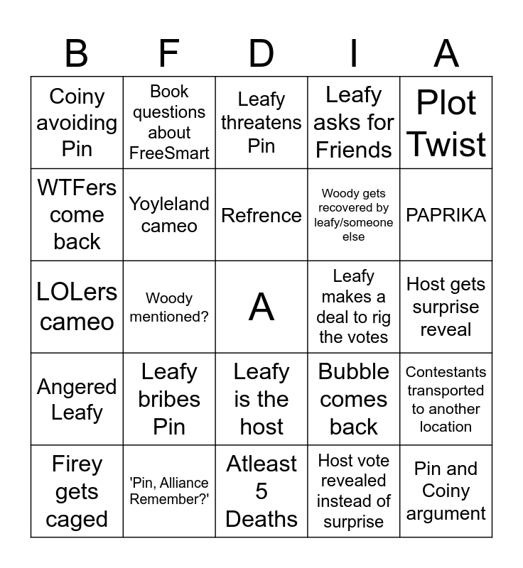 This bingo card has a free space and 24 words: Leafy bribes Pin, 'Pin, Alliance Remember?', Refrence, Firey gets caged, Plot Twist, Coiny avoiding Pin, WTFers come back, Book questions about FreeSmart, Leafy makes a deal to rig the votes, Leafy is the host, Woody gets recovered by leafy/someone else, LOLers cameo, Bubble comes back, Contestants transported to another location, Yoyleland cameo, Host vote revealed instead of surprise, Host gets surprise reveal, Leafy threatens Pin, PAPRIKA, Woody mentioned?, Pin and Coiny argument, Angered Leafy, Leafy asks for Friends and Atleast 5 Deaths.