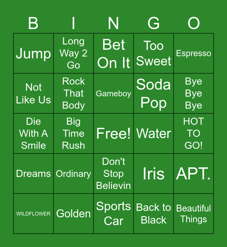 This bingo card has a free space and 24 words: Ordinary, Golden, Gameboy, WILDFLOWER, Espresso, Jump, Not Like Us, Long Way 2 Go, Water, Don't Stop Believin, Soda Pop, Die With A Smile, Iris, APT., Rock That Body, Back to Black, HOT TO GO!, Bet On It, Bye Bye Bye, Big Time Rush, Beautiful Things, Dreams, Too Sweet and Sports Car.