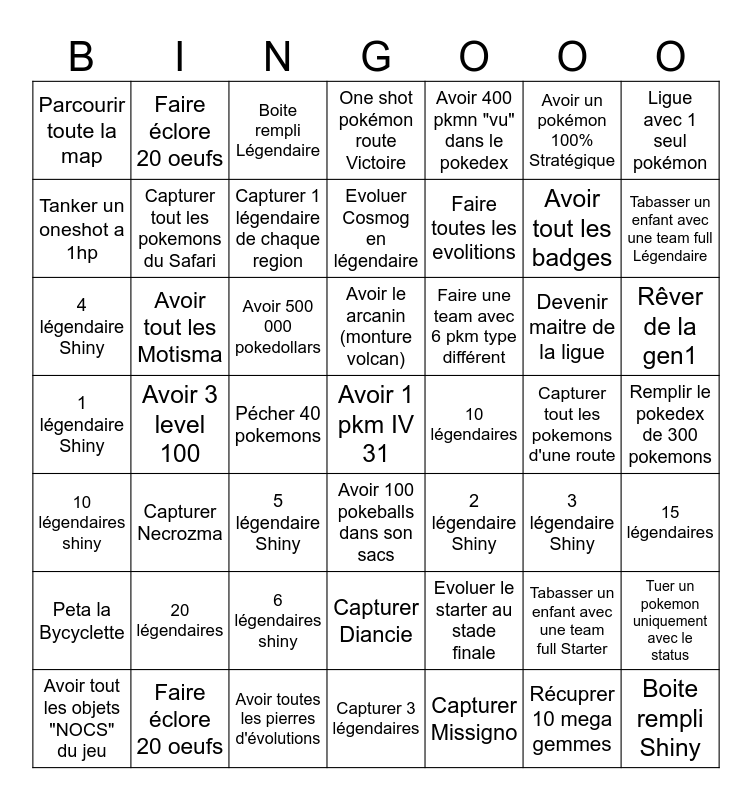 This bingo card has a free space and 48 words: Evoluer le starter au stade finale, Avoir tout les badges, Capturer 3 légendaires, Avoir 3 level 100, Avoir 500 000 pokedollars, Remplir le pokedex de 300 pokemons, Faire éclore 20 oeufs, Faire éclore 20 oeufs, Avoir un pokémon 100% Stratégique, Avoir 100 pokeballs dans son sacs, Ligue avec 1 seul pokémon, One shot pokémon route Victoire, Devenir maitre de la ligue, Faire une team avec 6 pkm type différent, Peta la Bycyclette, Capturer tout les pokemons d'une route, Tanker un oneshot a 1hp, Tabasser un enfant avec une team full Légendaire, Tabasser un enfant avec une team full Starter, Avoir 400 pkmn "vu" dans le pokedex, Faire toutes les evolitions, Pécher 40 pokemons, Parcourir toute la map, Capturer tout les pokemons du Safari, Tuer un pokemon uniquement avec le status, Capturer 1 légendaire de chaque region, Rêver de la gen1, Avoir tout les objets "NOCS" du jeu, Avoir le arcanin (monture volcan), Avoir tout les Motisma, Récuprer 10 mega gemmes, 10 légendaires, 15 légendaires, 20 légendaires, 1 légendaire Shiny, 2 légendaire Shiny, 3 légendaire Shiny, 4 légendaire Shiny, 5 légendaire Shiny, 6 légendaires shiny, 10 légendaires shiny, Boite rempli Shiny, Boite rempli Légendaire, Avoir toutes les pierres d'évolutions, Evoluer Cosmog en légendaire, Capturer Diancie, Capturer Necrozma and Capturer Missigno.