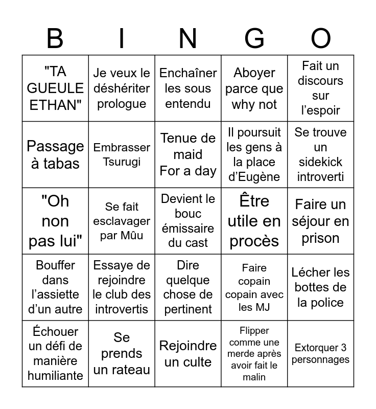 This bingo card has a free space and 24 words: Essaye de rejoindre le club des introvertis, Se prends un rateau, Tenue de maid For a day, Échouer un défi de manière humiliante, Fait un discours sur l’espoir, "TA GUEULE ETHAN", Passage à tabas, Je veux le déshériter prologue, Être utile en procès, Dire quelque chose de pertinent, Il poursuit les gens à la place d’Eugène, "Oh non pas lui", Faire copain copain avec les MJ, Lécher les bottes de la police, Embrasser Tsurugi, Flipper comme une merde après avoir fait le malin, Faire un séjour en prison, Enchaîner les sous entendu, Se trouve un sidekick introverti, Se fait esclavager par Mûu, Extorquer 3 personnages, Bouffer dans l’assiette d’un autre, Aboyer parce que why not and Rejoindre un culte.