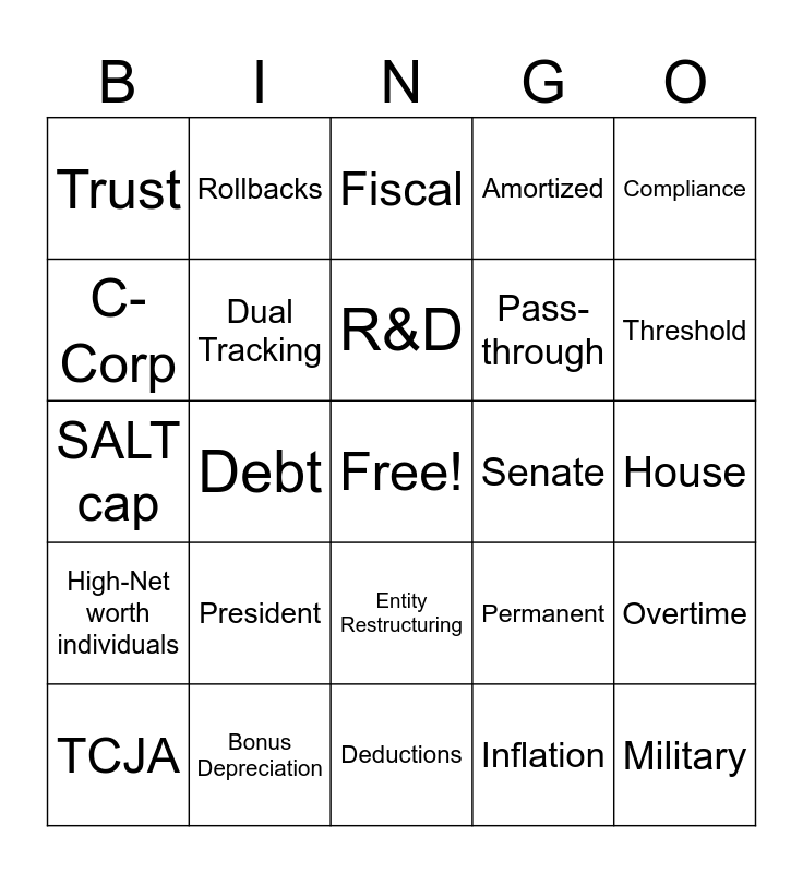 This bingo card has a free space and 40 words: QBI, SALT cap, 20%, Dual Tracking, Bonus Depreciation, Entity Restructuring, R&D, Gifts, Compliance, High-Net worth individuals, Debt, Amortized, Military, House, Senate, President, S-Corp, Trust, Clients, Fiscal, Overtime, Inflation, Pass-through, C-Corp, Tax, Spending, Gursey, EBITDA, Fillibuster, Tips, Tiered, TCJA, Medicaid, Permanent, Threshold, Deductions, Expensing, SNAP, Rollbacks and Trump.
