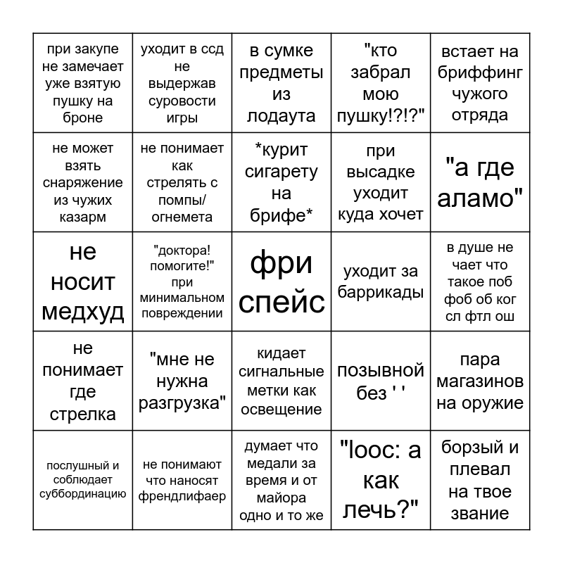 This bingo card has a free space and 24 words: "мне не нужна разгрузка", не понимают что наносят френдлифаер, *курит сигарету на брифе*, послушный и соблюдает суббординацию, встает на бриффинг чужого отряда, при закупе не замечает уже взятую пушку на броне, не может взять снаряжение из чужих казарм, уходит в ссд не выдержав суровости игры, уходит за баррикады, кидает сигнальные метки как освещение, при высадке уходит куда хочет, не носит медхуд, позывной без ' ', пара магазинов на оружие, не понимает как стрелять с помпы/огнемета, "looc: а как лечь?", в душе не чает что такое поб фоб об ког сл фтл ош, в сумке предметы из лодаута, "а где аламо", "доктора! помогите!" при минимальном повреждении, борзый и плевал на твое звание, не понимает где стрелка, "кто забрал мою пушку!?!?" and думает что медали за время и от майора одно и то же.