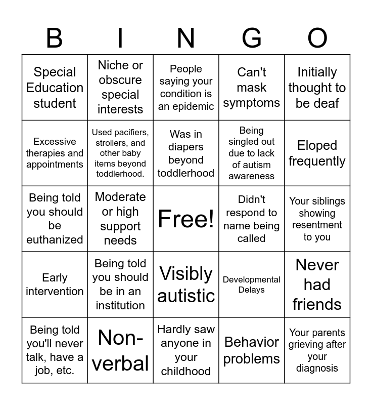 This bingo card has a free space and 24 words: Being told you should be in an institution, Non-verbal, Was in diapers beyond toddlerhood, Being told you'll never talk, have a job, etc., Initially thought to be deaf, Special Education student, Excessive therapies and appointments, Niche or obscure special interests, Didn't respond to name being called, Visibly autistic, Being singled out due to lack of autism awareness, Being told you should be euthanized, Developmental Delays, Never had friends, Used pacifiers, strollers, and other baby items beyond toddlerhood., Behavior problems, Your siblings showing resentment to you, People saying your condition is an epidemic, Eloped frequently, Moderate or high support needs, Your parents grieving after your diagnosis, Early intervention, Can't mask symptoms and Hardly saw anyone in your childhood.