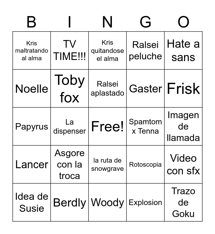 This bingo card has a free space and 24 words: Asgore con la troca, Berdly, Ralsei aplastado, Idea de Susie, Hate a sans, Kris maltratando al alma, Noelle, TV TIME!!!, Spamtom x Tenna, la ruta de snowgrave, Gaster, Papyrus, Rotoscopia, Video con sfx, Toby fox, Explosion, Imagen de llamada, Kris quitandose el alma, Frisk, La dispenser, Trazo de Goku, Lancer, Ralsei peluche and Woody.
