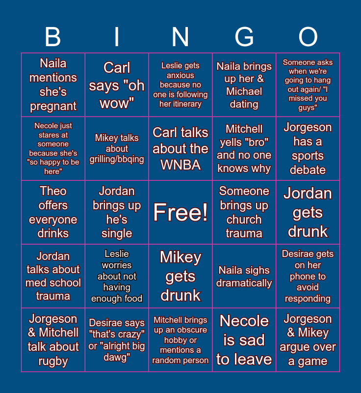 This bingo card has a free space and 24 words: Leslie worries about not having enough food, Desirae says "that's crazy" or "alright big dawg", Carl talks about the WNBA, Jorgeson & Mitchell talk about rugby, Someone asks when we're going to hang out again/ "I missed you guys", Naila mentions she's pregnant, Necole just stares at someone because she's "so happy to be here", Carl says "oh wow", Someone brings up church trauma, Mikey gets drunk, Mitchell yells "bro" and no one knows why, Theo offers everyone drinks, Naila sighs dramatically, Desirae gets on her phone to avoid responding, Mikey talks about grilling/bbqing, Necole is sad to leave, Jordan gets drunk, Leslie gets anxious because no one is following her itinerary, Jorgeson has a sports debate, Jordan brings up he's single, Jorgeson & Mikey argue over a game, Jordan talks about med school trauma, Naila brings up her & Michael dating and Mitchell brings up an obscure hobby or mentions a random person.