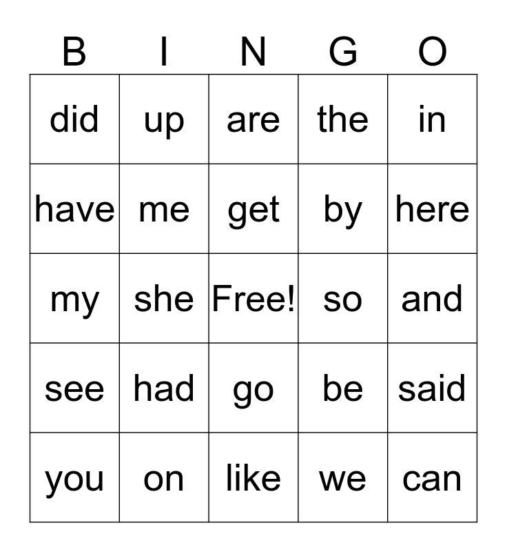 This bingo card has a free space and 24 words: had, on, get, you, in, did, have, up, so, go, by, my, be, said, me, we, and, are, here, she, can, see, the and like.