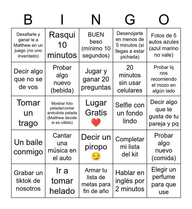 This bingo card has a free space and 24 words: Cantar una música en el auto, Ir a tomar helado, Jugar y ganar 20 preguntas, Grabar un tiktok de nosotros, Fotos de 5 autos azules (azul marino no vale), Desafiarle y ganar le a Matthew en un juego (no uno inventado), Decir algo que no se de vos, Rasqui 10 minutos, Selfie con un fondo lindo, Decir un piropo 😏, 20 minutos sin usar celulares, Tomar un trago, Completar mi lista del kit, Probar algo nuevo (comida), Probar algo nuevo (bebida), Hablar en inglés por 2 minutos, Decir algo que te gusta de tu pareja y pq, BUEN beso (mínimo 10 segundos), Probar lq nos recomiendo el mozo en algún lado, Mostrar foto pelada/contar anécdota pelada (Matthew decide si es válido), Elegir un perfume para que use, Un baile conmigo, Desenojarte en menos de 5 minutos (si llegas a estar pichada) and Armar tu lista de metas para fin de año.