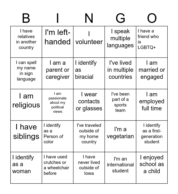 This bingo card has a free space and 24 words: I identify as a Person of color, I have used crutches or a wheelchair before, I identify as biracial, I identify as a woman, I have a friend who is LGBTQ+, I have relatives in another country, I can spell my name in sign language, I'm left-handed, I've been part of a sports team, I've traveled outside of my home country, I've lived in multiple countries, I am religious, I'm a vegetarian, I identify as a first-generation student, I am a parent or caregiver, I'm an international student, I am employed full time, I volunteer, I am married or engaged, I am passionate about my political views, I enjoyed school as a child, I have siblings, I speak multiple languages and I have never lived outside of Iowa.