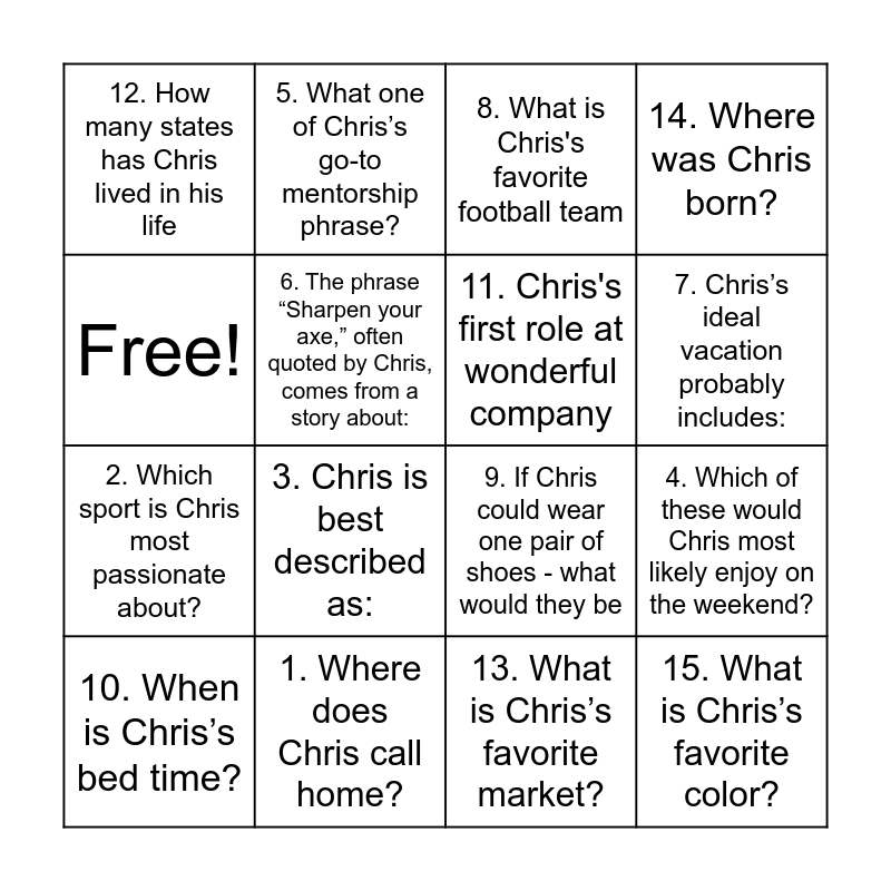 This bingo card has 16 words: 1. Where does Chris call home?, 4. Which of these would Chris most likely enjoy on the weekend?, 8. What is Chris's favorite football team, 12. How many states has Chris lived in his life, 2. Which sport is Chris most passionate about?, 5. What one of Chris’s go-to mentorship phrase?, 9. If Chris could wear one pair of shoes - what would they be, 13. What is Chris’s favorite market?, Free!, 6. The phrase “Sharpen your axe,” often quoted by Chris, comes from a story about:, 10. When is Chris’s bed time?, 14. Where was Chris born?, 3. Chris is best described as:, 7. Chris’s ideal vacation probably includes:, 11. Chris's first role at wonderful company and 15. What is Chris’s favorite color?.