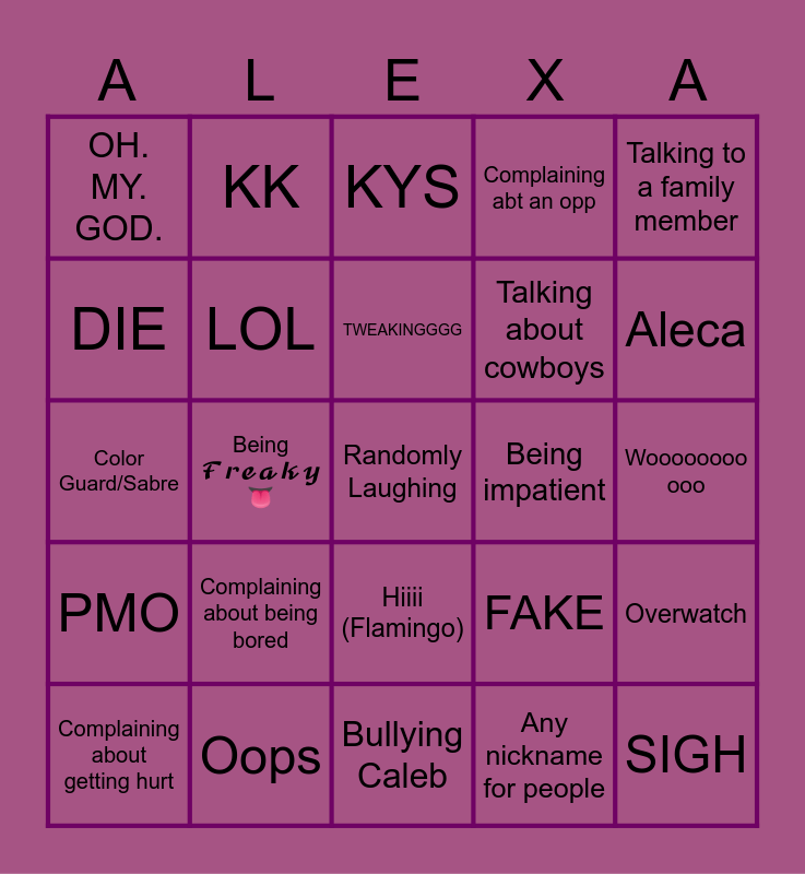 This bingo card has 27 words: FAKE, SIGH, Talking about cowboys, Bullying Caleb, DIE, KYS, KK, PMO, Being impatient, Overwatch, Color Guard/Sabre, Complaining abt an opp, Complaining about getting hurt, Oops, Aleca, Screaming, LOL, TWEAKINGGGG, Complaining about being bored, OH. MY. GOD., Woooooooo ooo, Any nickname for people, Being 𝓕𝓻𝓮𝓪𝓴𝔂 👅, Randomly Laughing, Hiiii (Flamingo), Talking to a family member and Randomly showing pets.