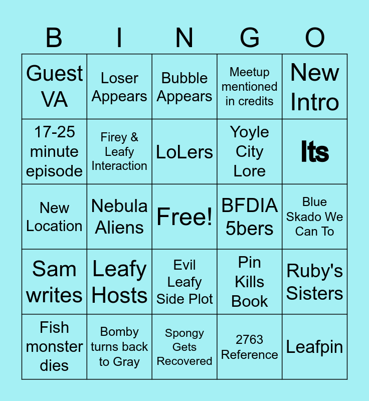 This bingo card has a free space and 24 words: Leafy Hosts, Bomby turns back to Gray, LoLers, Fish monster dies, New Intro, Guest VA, 17-25 minute episode, Loser Appears, BFDIA 5bers, Evil Leafy Side Plot, Yoyle City Lore, New Location, Pin Kills Book, Ruby's Sisters, Firey & Leafy Interaction, 2763 Reference, Blue Skado We Can To, Bubble Appears, Its, Nebula Aliens, Leafpin, Sam writes, Meetup mentioned in credits and Spongy Gets Recovered.