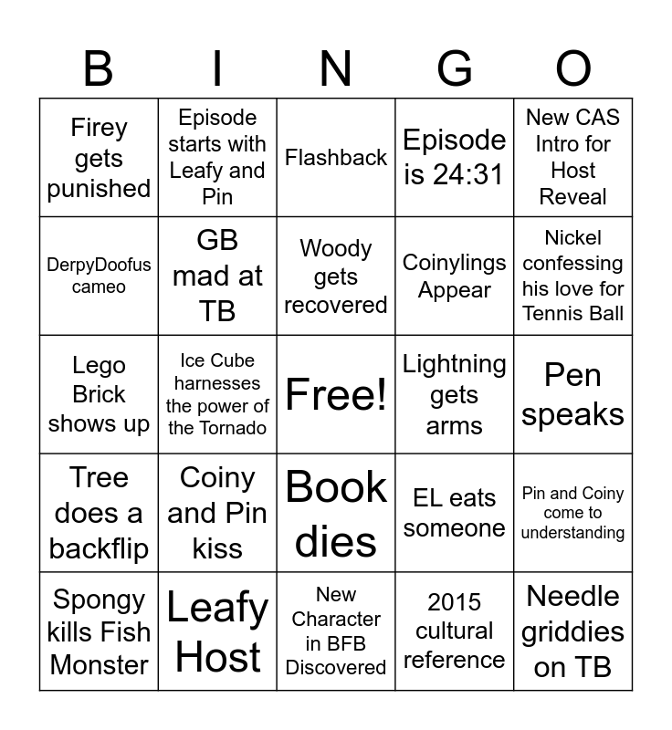 This bingo card has a free space and 24 words: Coiny and Pin kiss, Leafy Host, Woody gets recovered, Spongy kills Fish Monster, New CAS Intro for Host Reveal, Firey gets punished, DerpyDoofus cameo, Episode starts with Leafy and Pin, Lightning gets arms, Book dies, Coinylings Appear, Lego Brick shows up, EL eats someone, Pin and Coiny come to understanding, GB mad at TB, 2015 cultural reference, Pen speaks, Flashback, Nickel confessing his love for Tennis Ball, Ice Cube harnesses the power of the Tornado, Needle griddies on TB, Tree does a backflip, Episode is 24:31 and New Character in BFB Discovered.