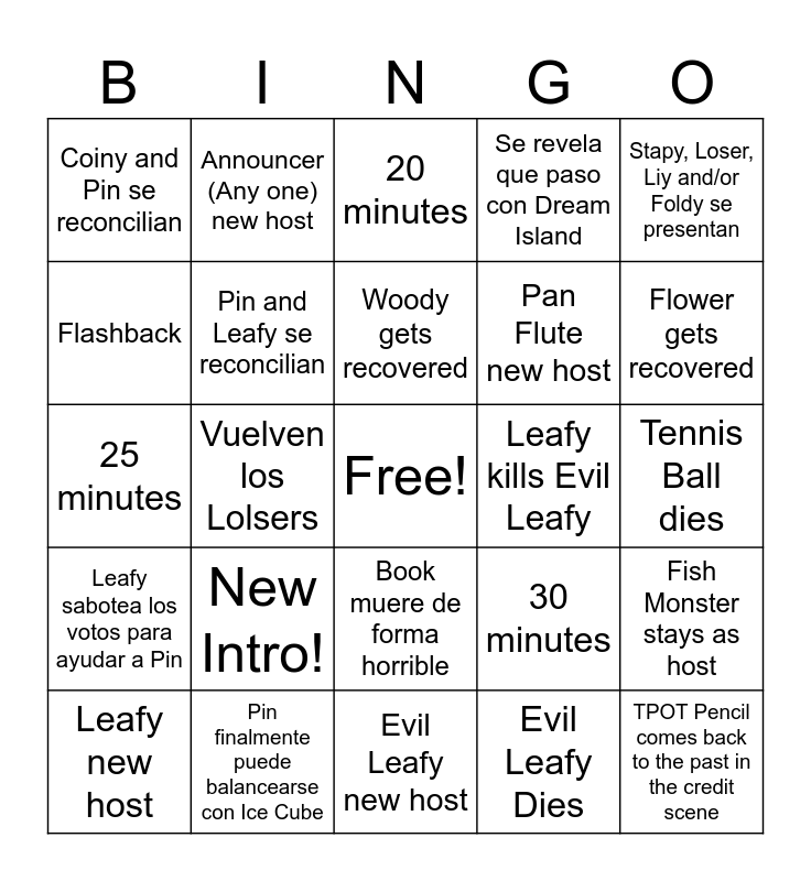 This bingo card has a free space and 24 words: Leafy new host, New Intro!, Woody gets recovered, Evil Leafy Dies, Stapy, Loser, Liy and/or Foldy se presentan, Coiny and Pin se reconcilian, Announcer (Any one) new host, 20 minutes, ​​Leafy kills Evil Leafy, Tennis Ball dies, 25 minutes, Pin and Leafy se reconcilian, 30 minutes, Fish Monster stays as host, Flashback, Pin finalmente puede balancearse con Ice Cube, Evil Leafy new host, Se revela que paso con Dream Island, Flower gets recovered, Leafy sabotea los votos para ayudar a Pin, Vuelven los Lolsers, Book muere de forma horrible, Pan Flute new host and ​​TPOT Pencil comes back to the past in the credit scene.