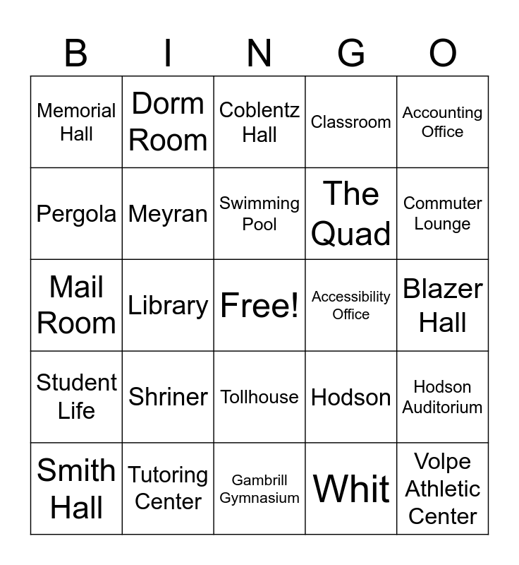 This bingo card has a free space and 29 words: Smith Hall, D-Hall, Library, Student Success Center, Memorial Hall, Coblentz Hall, Meyran, Shriner, Accessibility Office, Tutoring Center, Blazer Hall, Volpe Athletic Center, Gambrill Gymnasium, Whit, Commuter Lounge, Tatum, Tollhouse, Student Life, Accounting Office, Mail Room, Hodson, Rosenstock, The Quad, Pergola, Classroom, Dorm Room, Hodson Auditorium, Swimming Pool and Tennis Court.