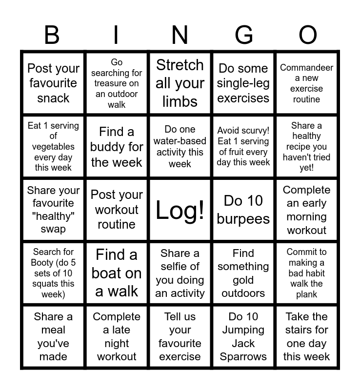 This bingo card has a free space and 32 words: Do 10 Jumping Jack Sparrows, Why's the rum gone? (Complete your hydration goal for the day), Post your workout routine, Show off your flask (waterbottle), Search for Booty (do 5 sets of 10 squats this week), Find a buddy for the week, Commandeer a new exercise routine, Commit to making a bad habit walk the plank, Go searching for treasure on an outdoor walk, Post photos of your horizon, Do one water-based activity this week, Stretch all your limbs, Do a core exercise, Do a 30 second plank, Do 10 burpees, Do some rowing! Prep for the seas., Share a meal you've made, Share your favourite "healthy" swap, Share a selfie of you doing an activity, Find a boat on a walk, Find something gold outdoors, Give us your best "Arrr!", Complete an early morning workout, Complete a late night workout, Take the stairs for one day this week, Do some single-leg exercises, Avoid scurvy! Eat 1 serving of fruit every day this week, Eat 1 serving of vegetables every day this week, Post your favourite snack, Tell us your favourite exercise, Share your challenge goals and Share a healthy recipe you haven't tried yet!.