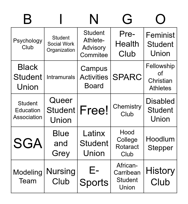 This bingo card has a free space and 26 words: Latinx Student Union, African-Carribean Student Union, Campus Activities Board, Nursing Club, Feminist Student Union, Psychology Club, Black Student Union, Student Social Work Organization, Disabled Student Union, Hood College Rotaract Club, SPARC, Student Education Association, Hoodlum Stepper, Modeling Team, Queer Student Union, Sustaining Hood, Pre-Health Club, SGA, Student Athlete-Advisory Commitee, History Club, Fellowship of Christian Athletes, E-Sports, Chemistry Club, Blue and Grey, Intramurals and Dance Team.