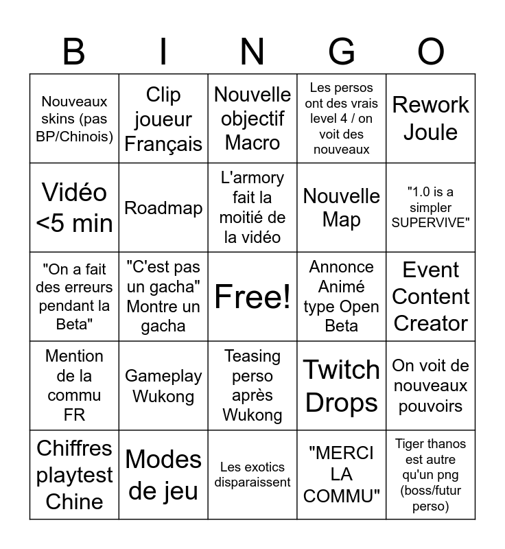 This bingo card has a free space and 24 words: Gameplay Wukong, Modes de jeu, L'armory fait la moitié de la vidéo, Chiffres playtest Chine, Rework Joule, Nouveaux skins (pas BP/Chinois), Vidéo <5 min, Clip joueur Français, Annonce Animé type Open Beta, Teasing perso après Wukong, Nouvelle Map, "On a fait des erreurs pendant la Beta", Twitch Drops, On voit de nouveaux pouvoirs, Roadmap, "MERCI LA COMMU", Event Content Creator, Nouvelle objectif Macro, "1.0 is a simpler SUPERVIVE", "C'est pas un gacha" Montre un gacha, Tiger thanos est autre qu'un png (boss/futur perso), Mention de la commu FR, Les persos ont des vrais level 4 / on voit des nouveaux and Les exotics disparaissent.