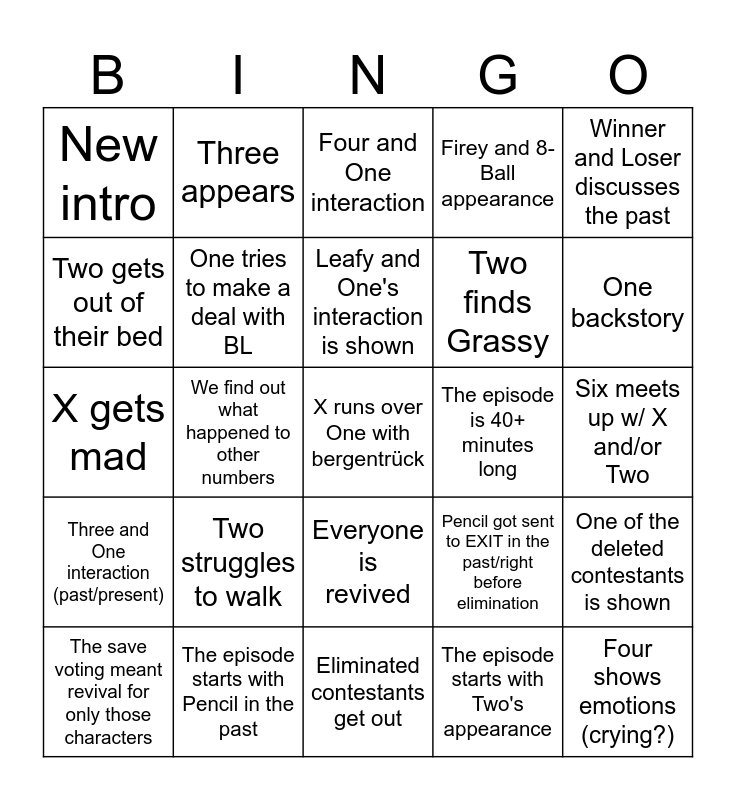 This bingo card has a free space and 24 words: Two struggles to walk, The episode starts with Pencil in the past, Leafy and One's interaction is shown, The save voting meant revival for only those characters, Winner and Loser discusses the past, New intro, Two gets out of their bed, Three appears, The episode is 40+ minutes long, Everyone is revived, Two finds Grassy, X gets mad, Pencil got sent to EXIT in the past/right before elimination, One of the deleted contestants is shown, One tries to make a deal with BL, The episode starts with Two's appearance, Six meets up w/ X and/or Two, Four and One interaction, One backstory, We find out what happened to other numbers, Four shows emotions (crying?), Three and One interaction (past/present), Firey and 8-Ball appearance and Eliminated contestants get out.
